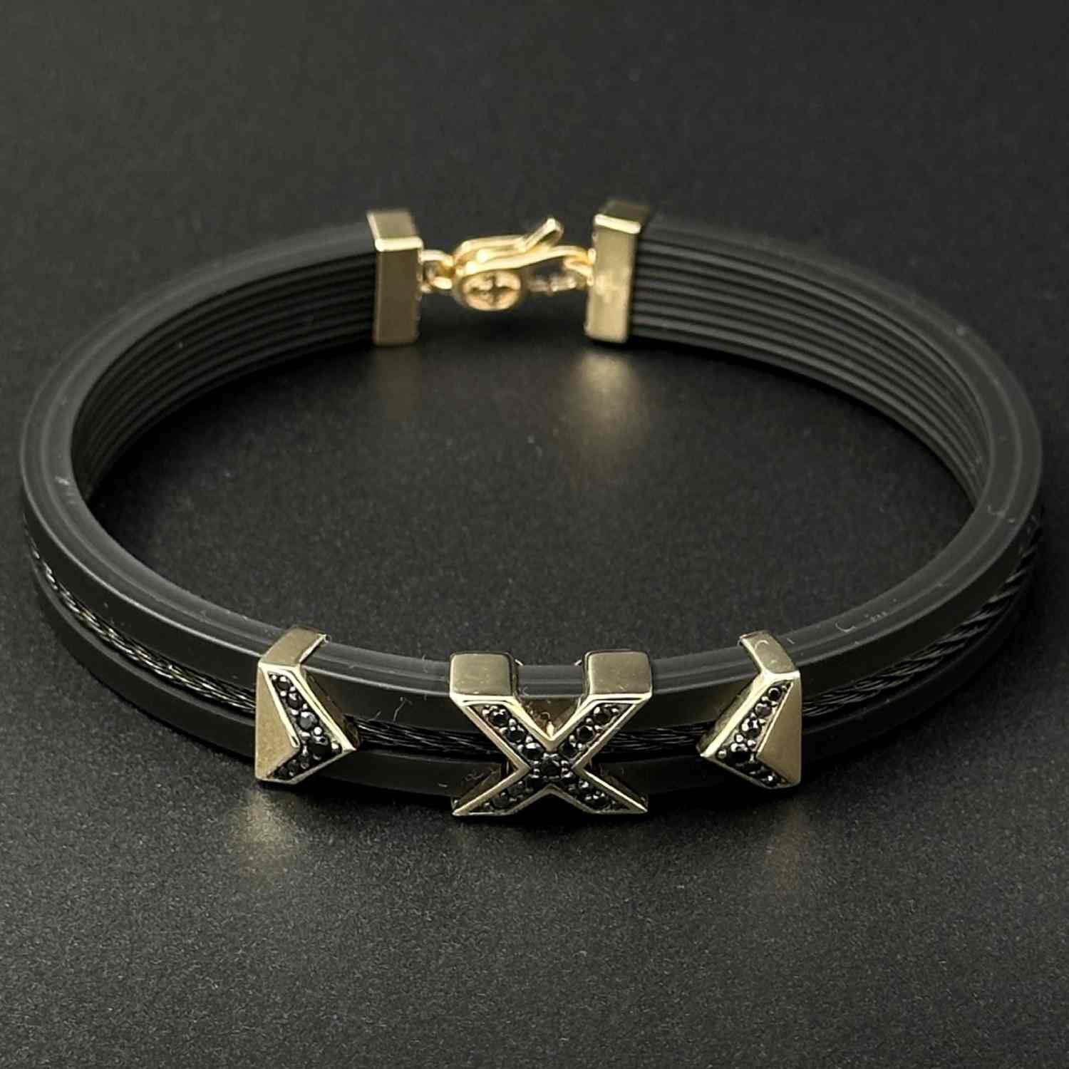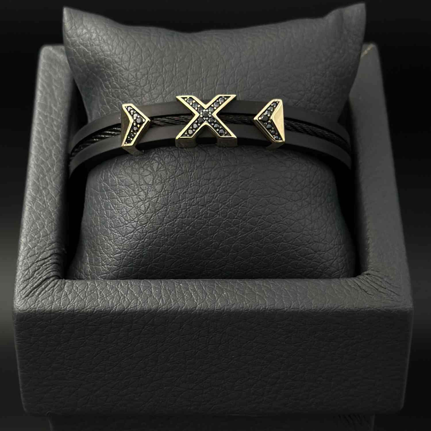 دستبند چرم وسط استیل ایکس نگین دار مشکی